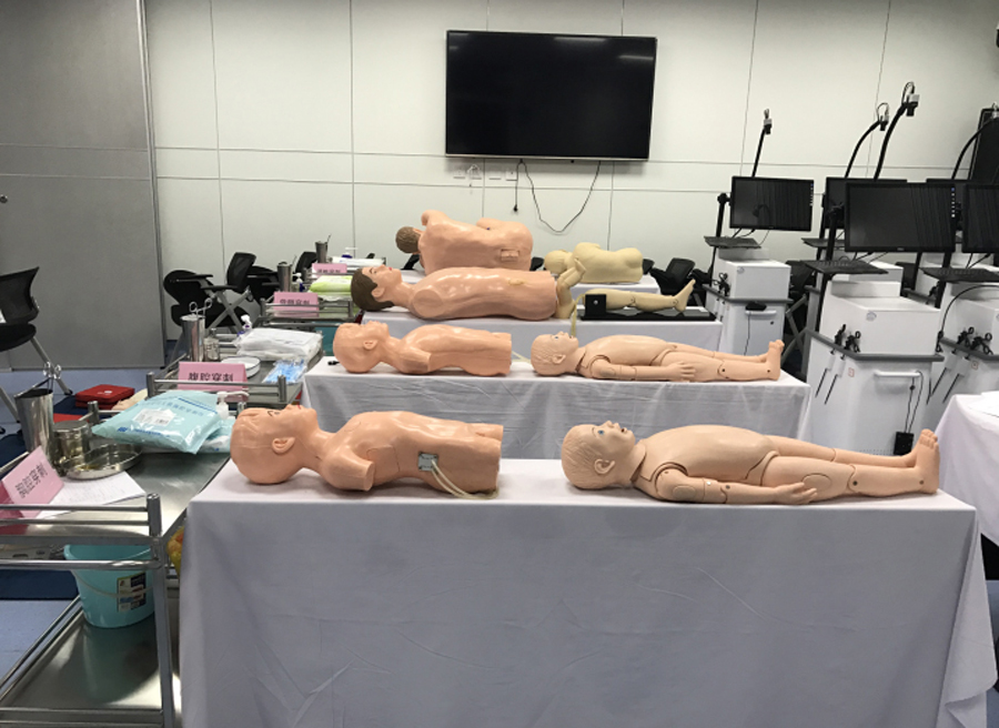 临床实践技能培训中心教学设备齐全,培训场地空间独立。建筑面积约2300平米,其中包含体格检查室、儿内科基础技能室、儿外科基础技能室、护理技能室、AHA急救技能培训室、多媒体教室、临床思维训练室、研究生授课室/备课室、模拟ICU病房、动物手术室以及10个临床考站等。配备了高仿真综合模拟婴儿(瑞恩)、高仿真综合模拟儿童(彼得)、实时3D重建解剖影像及手术计划训练系统、腹腔镜虚拟训练系统、临床思维训练系统等,供给学员在操作中学习,提高操作技能,增强临床实践信心。