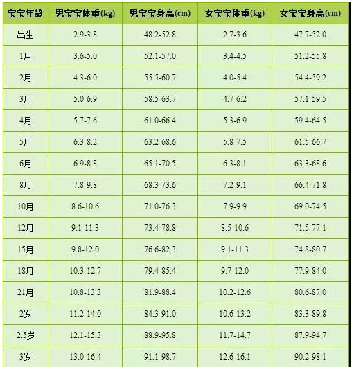 0-10岁宝宝身高体重标准对照表: