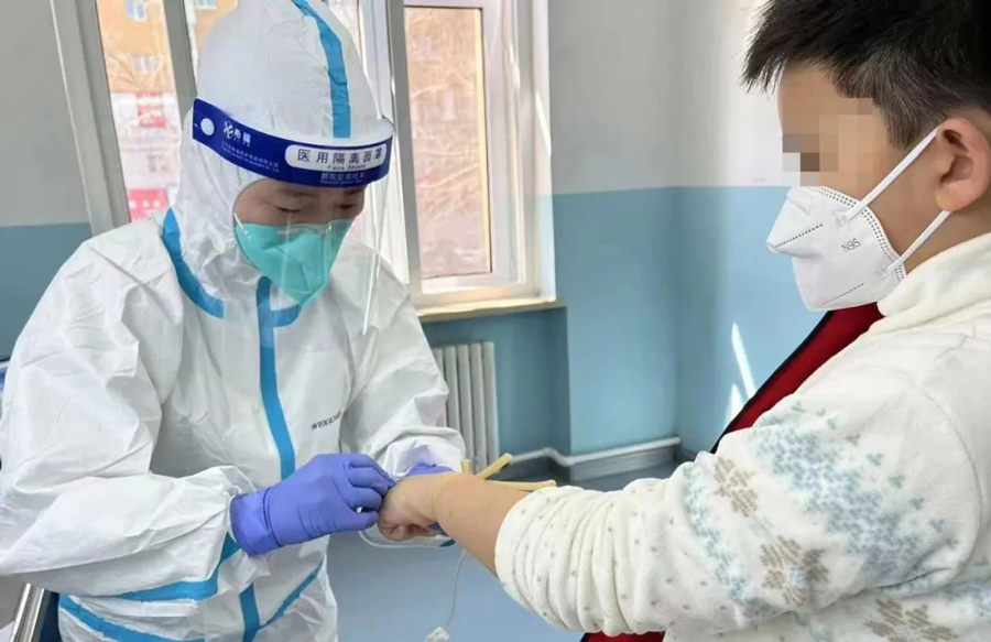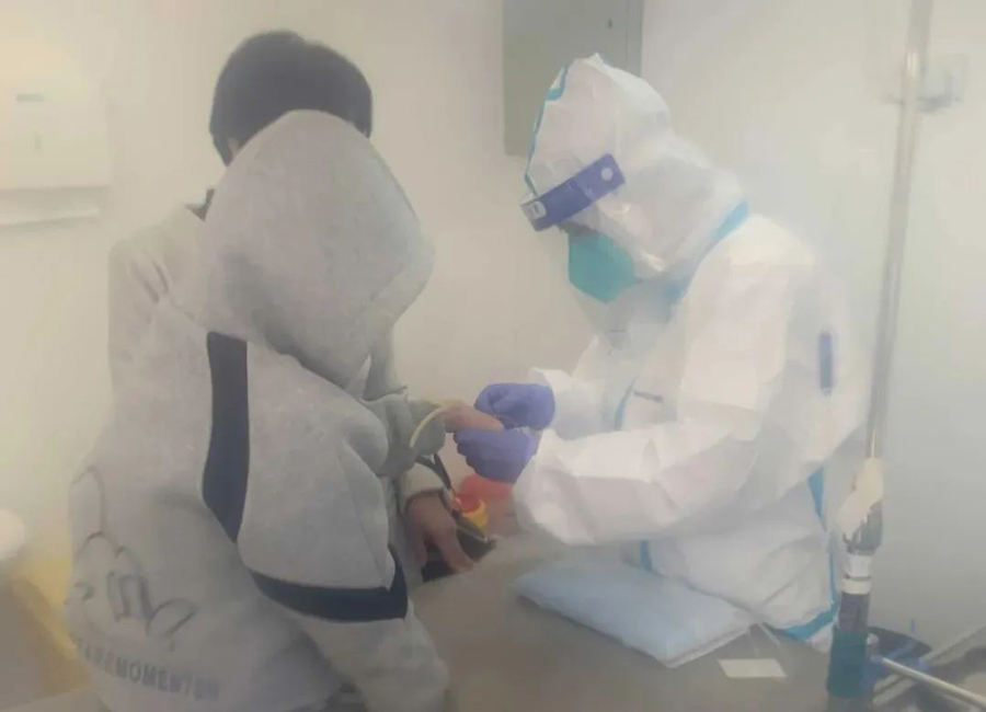 “医生,孩子高烧俩小时了,咋办?”护士闻声快速上车,在车内进行抗原检测,结果:阳性。但患儿已经高热2个小时并伴有抽搐,情况危急,不容再耽搁。医护人员没有再去考虑,立即将孩子安置在发热门诊高风险区,进一步救治。孩子高热、抗原阳性,更加剧了家属的焦虑。团队在救治的同时,也尽量安抚家属的情绪。渐渐地,患儿体温恢复正常,家属的情绪平稳了许多。但最后患儿核酸回报为:阳性。团队立即安排转运事宜。