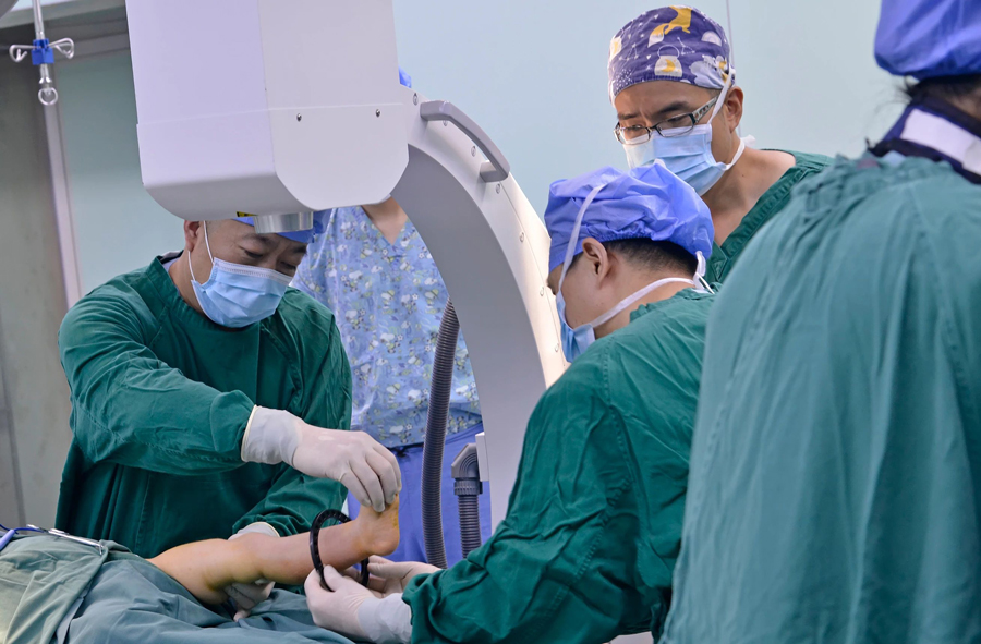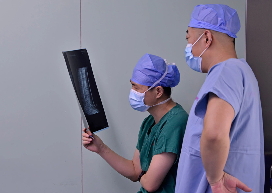8月11日12时30分,手术开始。手术室外,萱萱家人焦急等待;手术室内,团队协作,按照既定方案有序进行。术中,李浩教授在患儿左胫骨前侧开切口,长度约3cm,切除部分胫骨硬化病灶,并取同侧髂骨松质骨备用。随后,穿入直径2.0mm弹性髓内钉固定断端,取髂骨及同种异体骨进行植骨,并缝合切口。最后,采用C臂机下环形外固定架对患处进行加压固定。在医生、麻醉、护理团队的严密配合与协作下,手术历时4小时顺利完成。