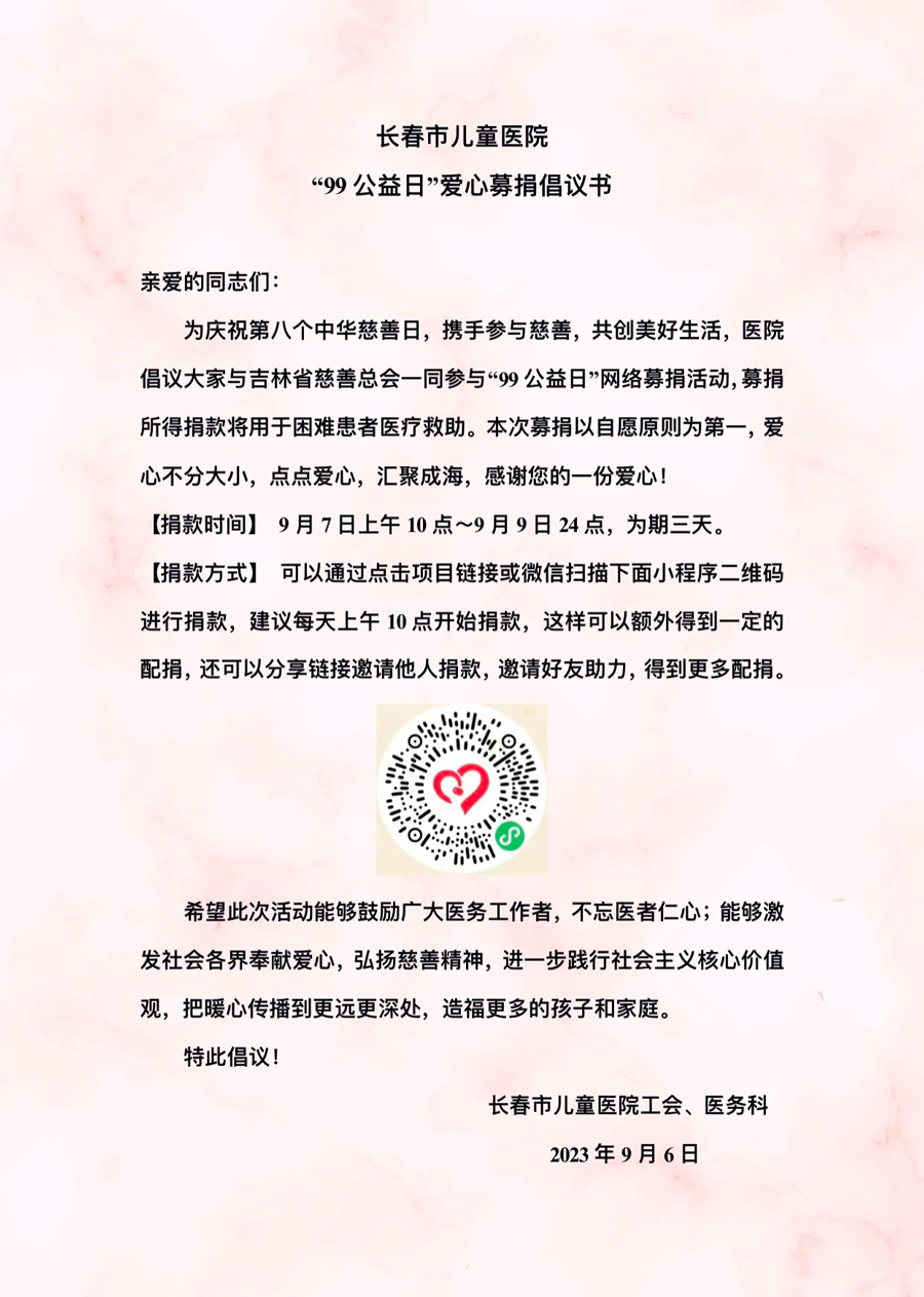 弘扬中华传统美德,助力慈善事业发展。为庆祝第八个“中华慈善日”,9月7日—9月9日,啪啪网 工会、医务科组织全院职工,与吉林省慈善总会共同参与“99公益日”网络募捐活动,携手参与慈善,共创美好生活。