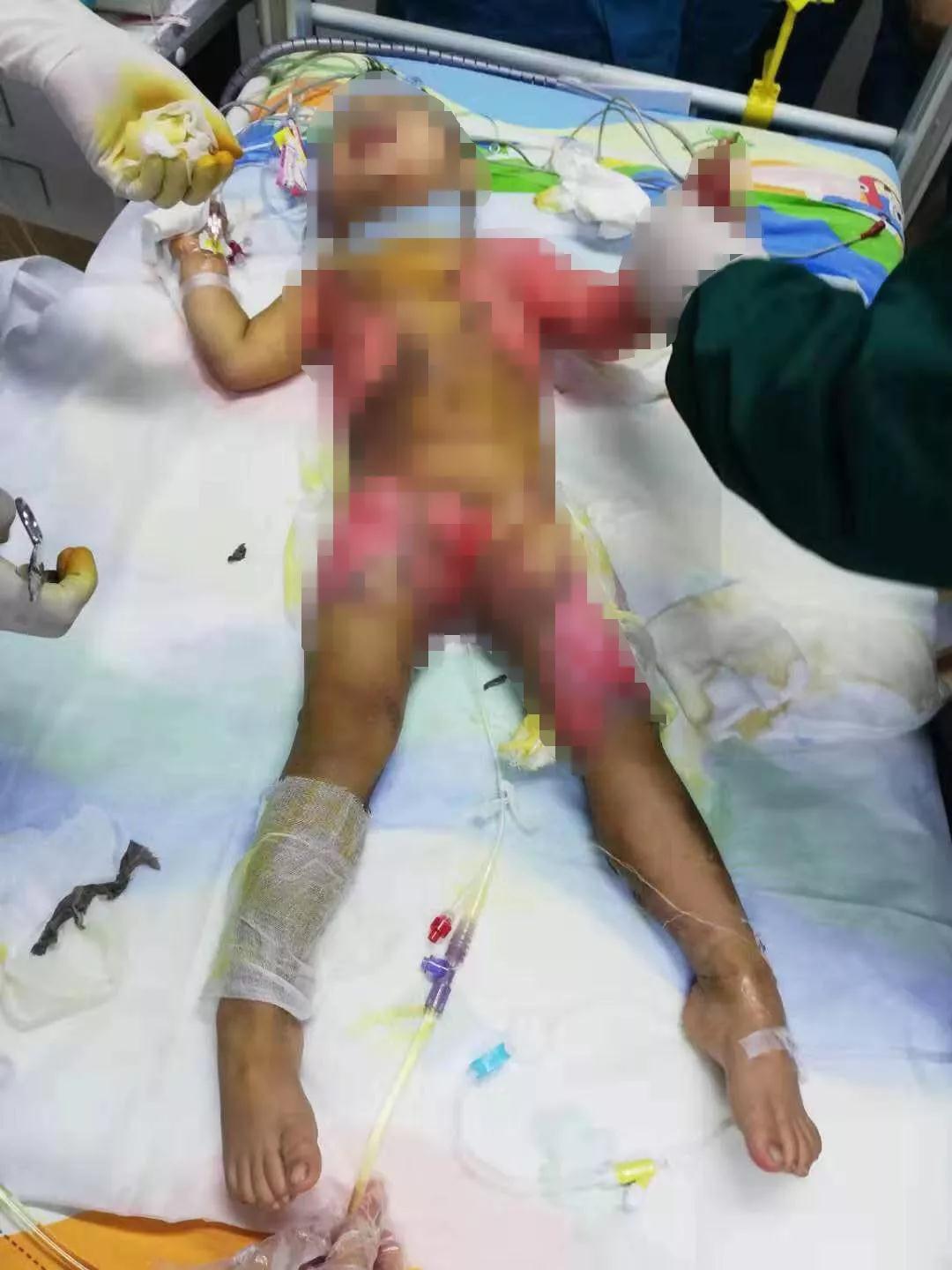 10月7日半夜,一阵阵孩子撕心裂肺的哭声响彻医院大厅,强强(化名)被紧急送进急诊科,当时,强强已经处于休克状态。根据家长讲述,孩子是不小心掉到了煮拉面锅里的。烧伤科主任康生军介绍,强强送到医院时,情况非常危险,烫伤面积达60%,属特重度烫伤。对于这么小的孩子来讲,相当于全身重度烫伤,其中深II度烫伤面积达40%,浅II度烫伤面积达20%。小小的身子,除了头部几乎全部烫伤。接诊后,医院立即进行一系列紧急救治,包括清理创面、吸氧、建立静脉通路、补液、纠正休克及离子紊乱、抗炎对症治疗等。