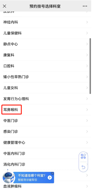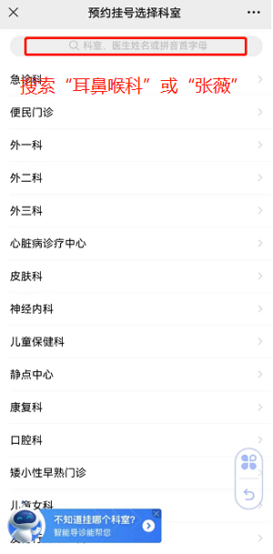 ②在搜索栏搜索“耳鼻喉科”或“张薇”,预约挂号