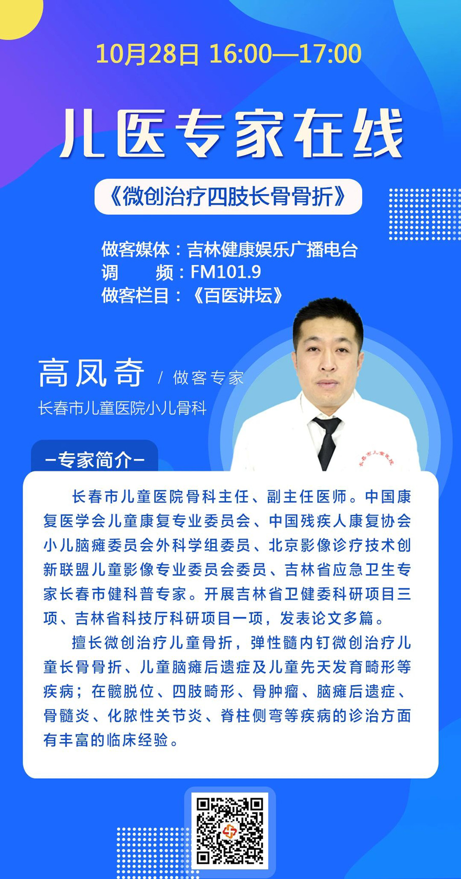 10月28日、29日,啪啪网 骨科主任高凤奇将做客吉林健康娱乐广播电台《百医讲坛》,为家长传递骨科知识。微创治疗四肢长骨骨折、儿童“歪脖”就是肌性斜颈吗……这些家长常关注的骨科方面问题,高凤奇主任届时将一一为家长解答,期待您准时收听。