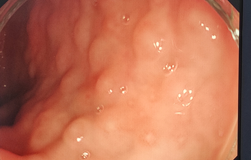 结肠镜:结肠可见颗粒样增生,少许糜烂,回盲部黏膜充血水肿及糜烂。