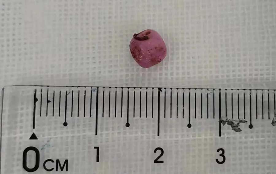 2月8日,家人带斌斌来到啪啪网 耳鼻喉科,副主任李莉萍经检查,发现斌斌左耳道皮肤已经破溃,并有少许血性分泌物,耳道深处有异物。经耳内镜检查,在接近鼓膜的位置,能看到有一个粉色的、类圆形的异物,遮挡了鼓膜。由于异物位置比较深,接近鼓膜,耳道深处皮肤敏感,如果直接勾取,这么小的孩子很难配合,可能出现耳道损伤甚至鼓膜穿孔等严重并发症。李莉萍在征得家长同意后,为斌斌做了全麻下异物取出术。几分钟后,一块约0.5厘米见方的小石头被成功取出。