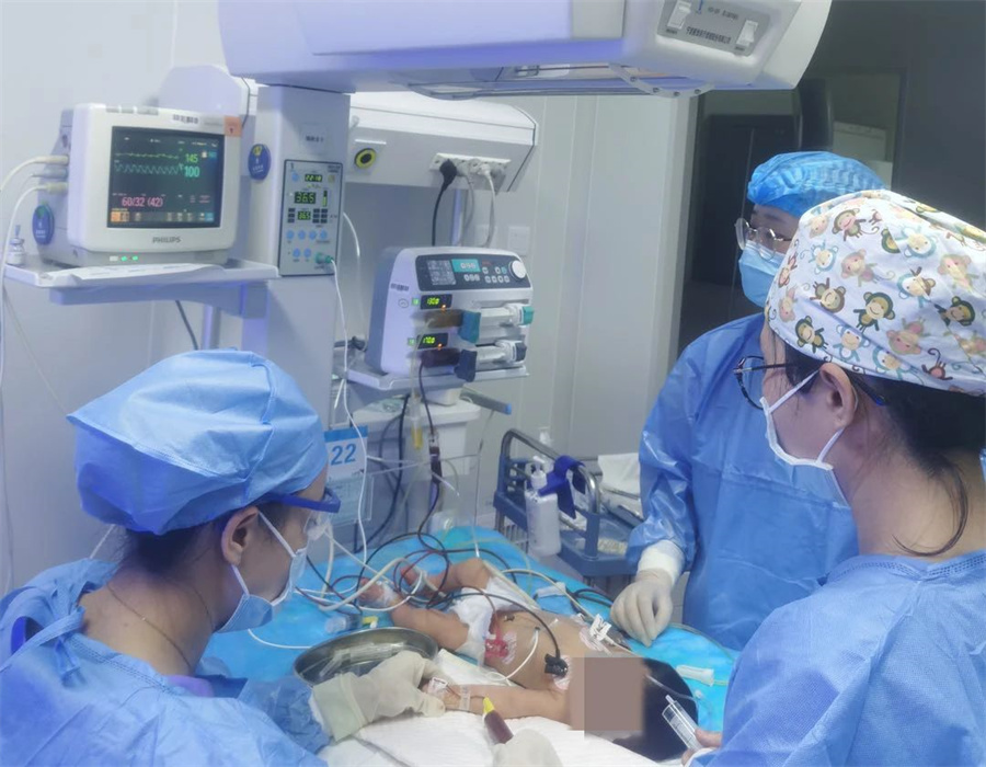 安安转到新生儿科(NICU)时,胆红素已经飙升至24.3mg/dL,即将达到换血临界值!在开展新生儿溶血检查的同时,科室主任包进与输血科联系调配适配血源,并组织团队启动蓝光照射、输注白蛋白和丙球等对症治疗。在检测报告确定是溶血性黄疸后,团队密切配合、严密监护,通过导管将血液注入患儿体内。胆红素开始稳步下降,警报解除。