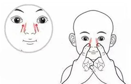 用双手食指指腹自鼻梁两侧鼻翼处开始至鼻根部,来回推擦30下,至鼻梁发热,慢慢揉着一般能出来些鼻涕。