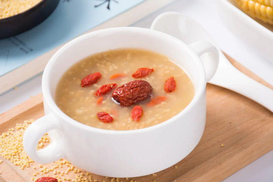 将大米放入高汤中,用中火炖煮成粥,开锅后再加入枸杞一起煮,鸡胸肉则撕成丝备用。