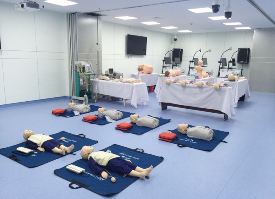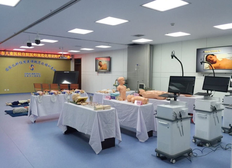 临床实践技能培训中心教学设备齐全,培训场地空间独立。建筑面积约2300平米,其中包含体格检查室、儿内科基础技能室、儿外科基础技能室、护理技能室、AHA急救技能培训室、多媒体教室、临床思维训练室、研究生授课室/备课室、模拟ICU病房、动物手术室以及10个临床考站等。配备了高仿真综合模拟婴儿(瑞恩)、高仿真综合模拟儿童(彼得)、实时3D重建解剖影像及手术计划训练系统、腹腔镜虚拟训练系统、临床思维训练系统等,供给学员在操作中学习,提高操作技能,增强临床实践信心。