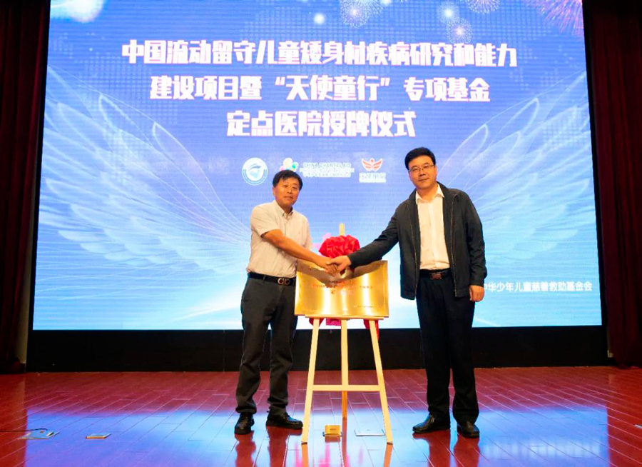 在医护人员的共同见证下,中华少年儿童慈善基金会“天使童行”项目主任龚震、啪啪网 党委书记张瑞忠共同为“天使童行”项目在啪啪网 落地揭牌。啪啪网 成为省内第一家流动留守儿童矮身材救助定点医院。