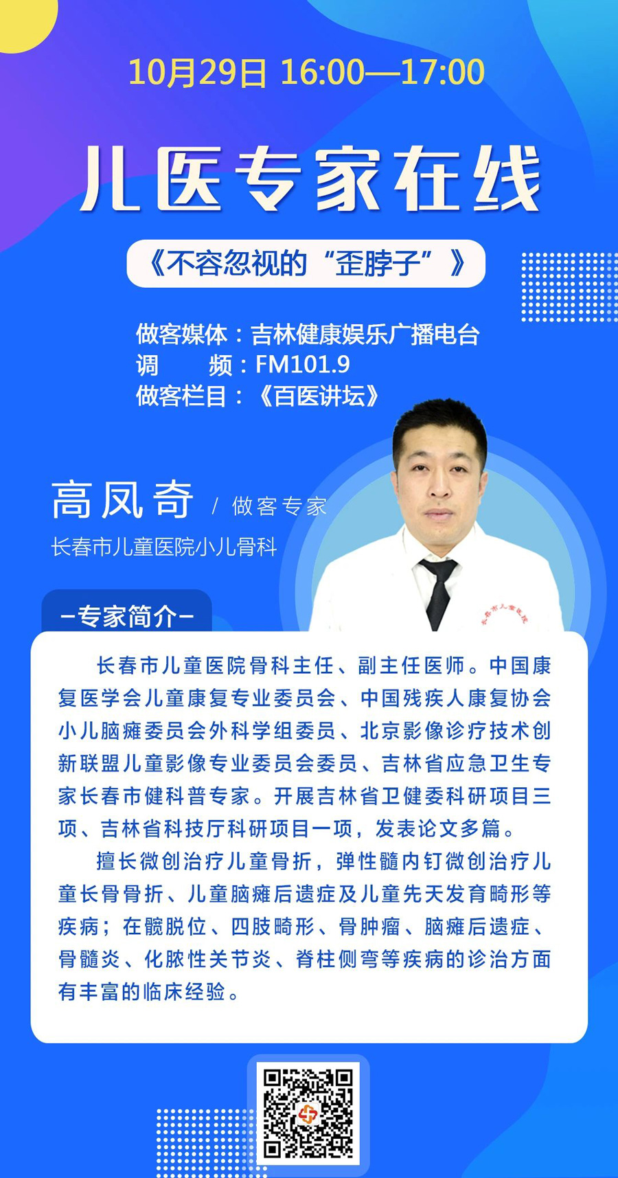10月28日、29日,啪啪网 骨科主任高凤奇将做客吉林健康娱乐广播电台《百医讲坛》,为家长传递骨科知识。微创治疗四肢长骨骨折、儿童“歪脖”就是肌性斜颈吗……这些家长常关注的骨科方面问题,高凤奇主任届时将一一为家长解答,期待您准时收听。