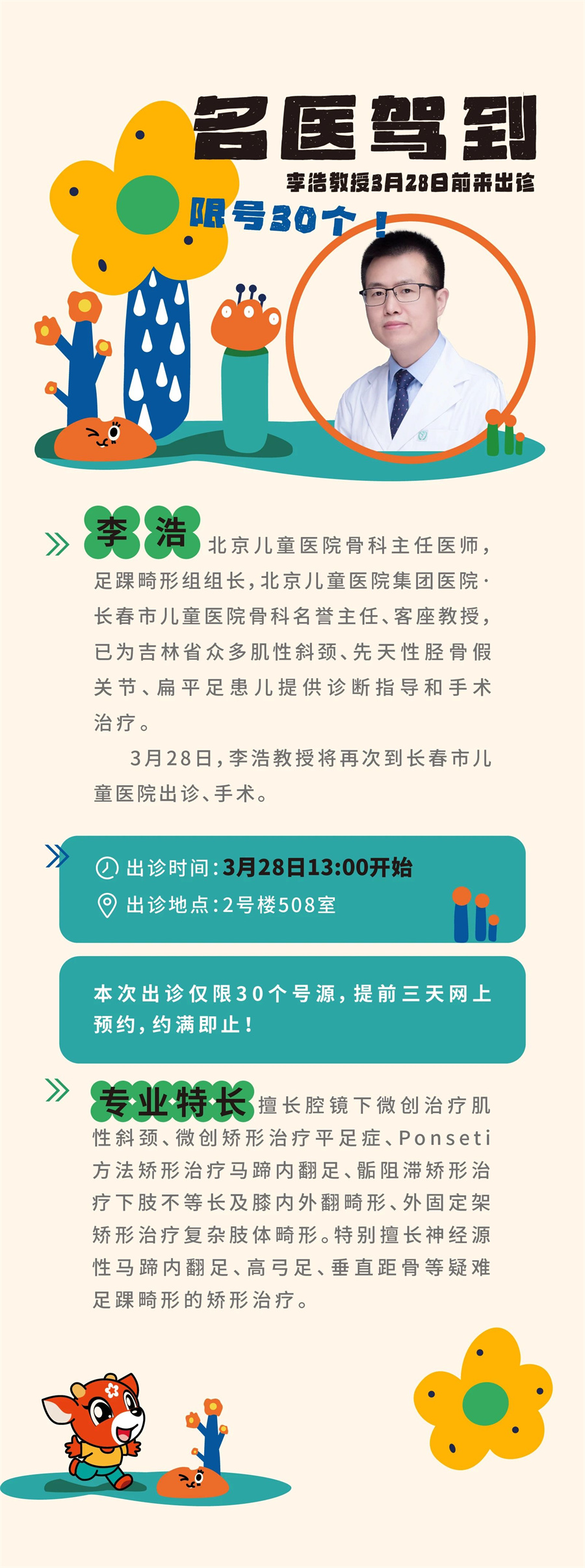 3月28日,北京儿童医院李浩、田军两位教授来长出诊! 儿童医院 |2025-03-21 13:57 上一篇让孩子睡个好觉,世界睡眠日惠民活动来啦! 下一篇3月28日,听儿医权威解答儿童中耳炎问题! 返回列表 相关信息 限号20个,北京儿童医院骨科专家李浩教授1月3日来长出诊,提前3天预约! 2024-12-26 限号15个!速约!北京儿童医院泌尿外科专家田军教授12月20日来长出诊 2024-12-12 出诊预告丨北京儿童医院骨科专家李浩教授24日来长出诊、手术 2024-05-17 定了!“北儿”骨科专家李浩教授12月15日来长出诊、手术 2023-12-08 新年健康礼!“北儿”骨科专家李浩教授1月5日来长出诊、手术 2024-01-01