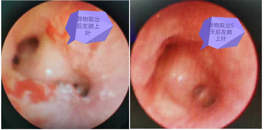边鹏说,异物在人体组织内会刺激组织黏膜,产生炎症反应。像轩轩,如果不及时取出异物,肉芽组织会逐渐将整个肺叶堵上,影响肺叶功能。边鹏提醒,如果孩子出现长期咳嗽不见好,且曾有呛入史,一定要做气管镜来明确病因,进一步治疗。