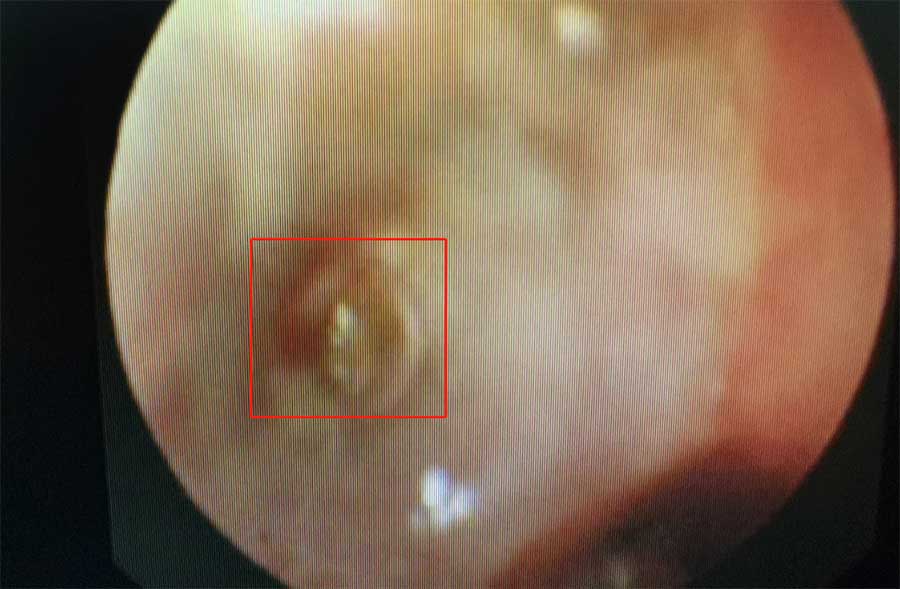 内镜中心主任赵芳兴经详细问诊,了解到:2个多月来,轩轩虽然咳得并不严重,但一直不见好,辗转了几家医院治疗,都不见效。赵芳兴再仔细追问,才发现,轩轩2个月前曾有过一次异物呛入史。是异物造成的咳嗽?支气管镜检查结果证实了赵芳兴的判断。在轩轩左肺上叶基底段有一个透明异物,周围的肉芽组织几乎将其包裹上。取出异物,是治疗的最好办法。