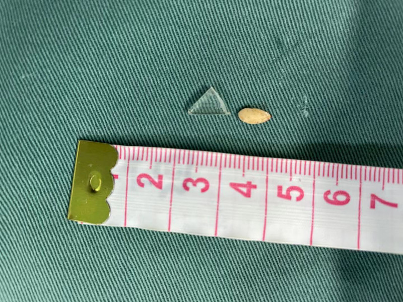 李萍介绍,经耳内镜检查,发现乐乐耳道外侧卡着一个硬质异物,边缘较硬,极易划伤耳道,而耳道里侧还卡着一个黄色异物,具体情况不明。乐乐全麻后,李萍利用异物钳将外侧异物取出,是一块掰碎的三角尺尖端,随后又将内侧异物取出,看起来像瓜籽仁。