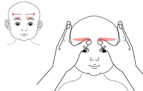自眉心至眉梢成一条直线,用两拇指自眉心向两侧眉梢分推30-50次。